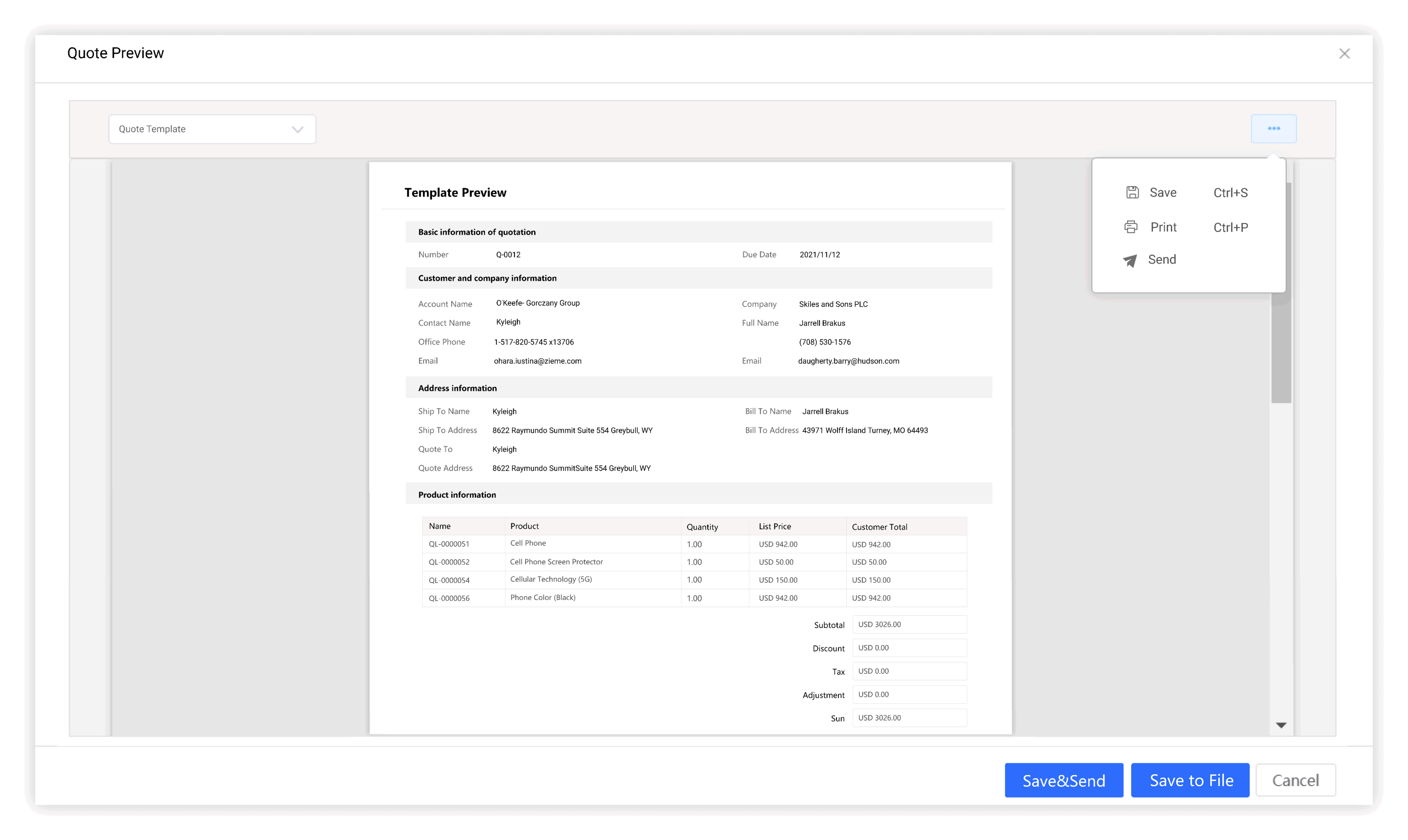 Imprima as cotações via modelos e entregue as cotações em papel aos clientes ou envie aos clientes por email.