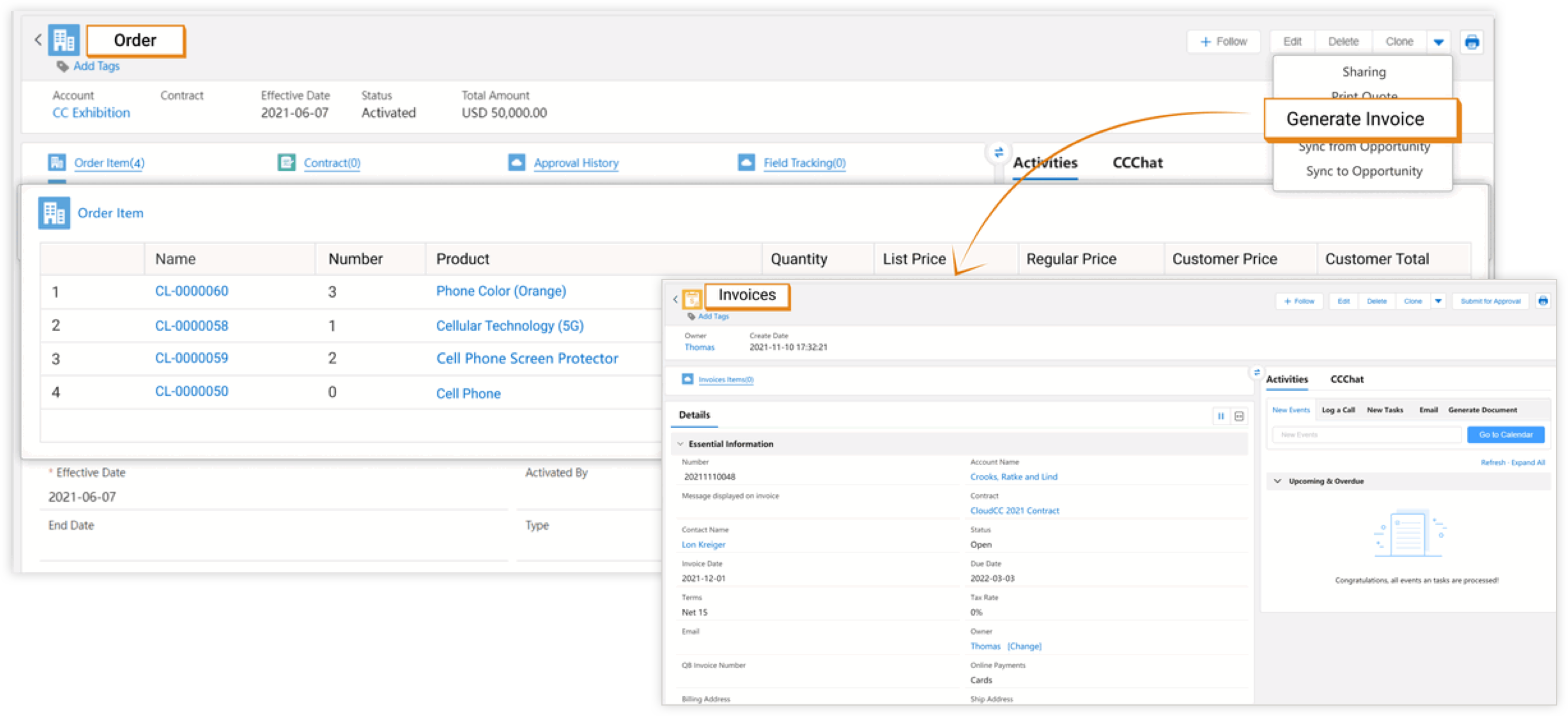 在商机推进时,销售人员往往需要随时查看产品目录与价格表,多次为客户进行报价,并在确认报价后记录客户的订单,完成订单收款并开具发票。CloudCC 提供完整的报价、订单、收款、发票管理工具,在系统内将数据关联,自动同步更新,助力您的销售人员快速完成交易,减少差错。