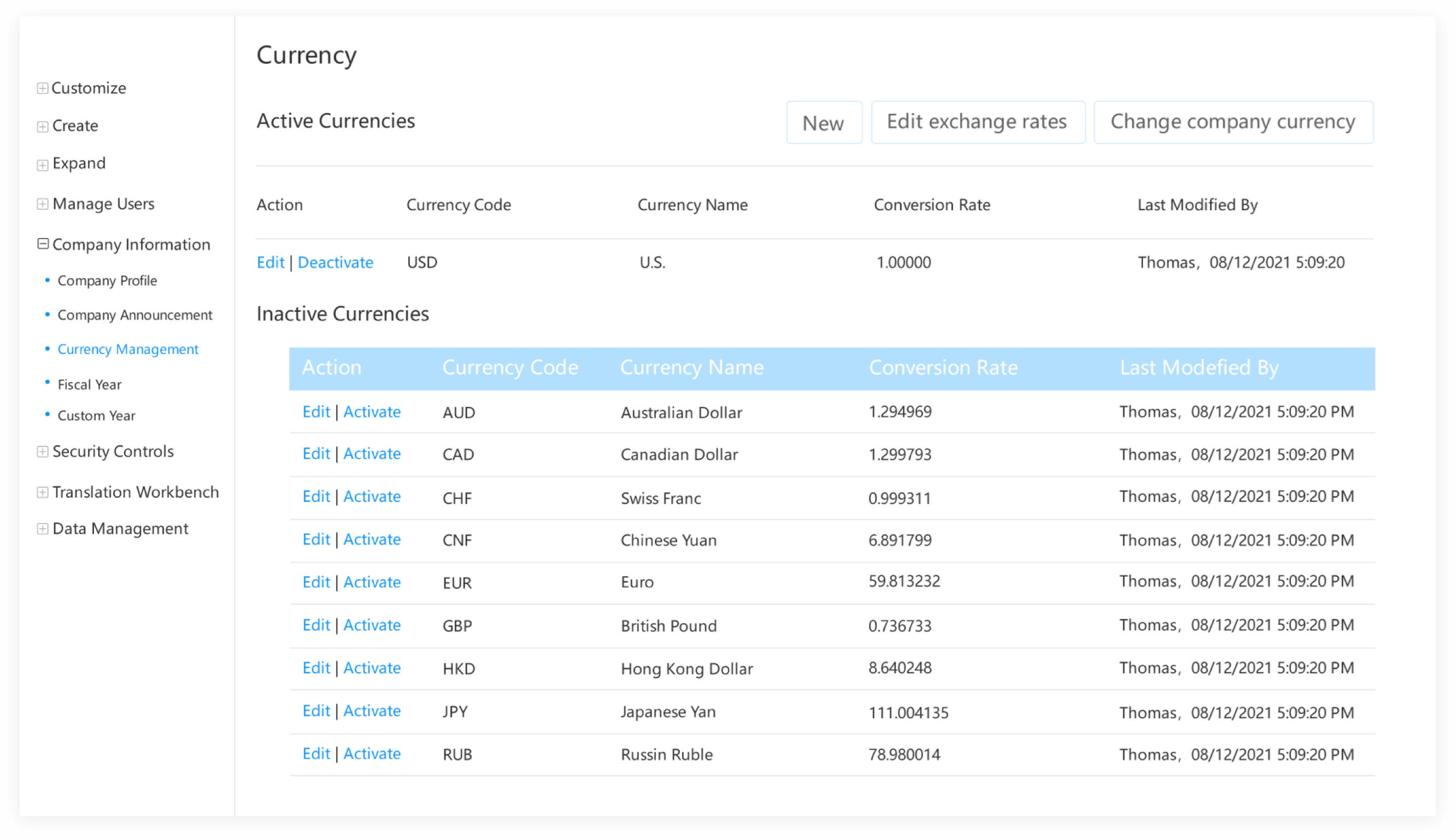 CloudCC unterstützt mehrere Sprachen, bis zu 14 verschiedene Sprachen. Englisch, vereinfachtes Chinesisch, Japanisch, Spanisch, Französisch und traditionelles Chinesisch sind standardmäßig verfügbar oder können bei Bedarf unabhängig hinzugefügt werden. Die Benutzer können über die Übersetzungsworkbench zwischen verschiedenen Sprachen wechseln oder in die gewünschte Sprache übersetzen. Derzeit wird die Übersetzung von Komponenten wie Objekten, Feldern, Bezugslisten und Optionslisten unterstützt.