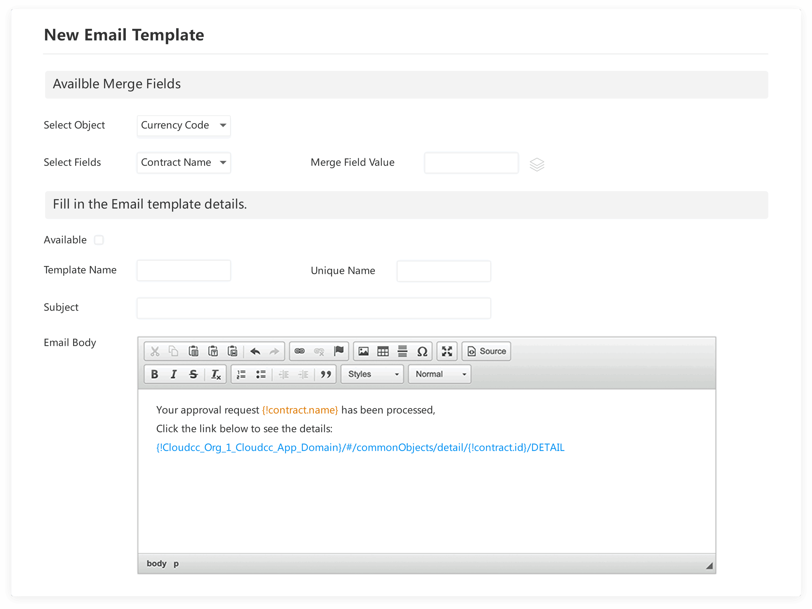 CloudCC bietet die Funktion "Documents Merging", um Dokumente in die Vorlagenbibliothek hochzuladen. Zum Beispiel kann diese Funktion für ein Vertragsmodul dynamisch Felder wie Kontoname, Vertragsbeginn, Vertragsende, Vertragssumme usw. in ein Dokument generieren. Sie können schnell eine Vertragsvorlage definieren und sie in die Vorlagenbibliothek hochladen. Wählen Sie im Modul "Aktivität" auf der Seite mit den Datensatzdetails unter "Dokument generieren" eine Vorlage aus, und erzeugen Sie automatisch eine WordDatei mit dem Vertrag. Sie können das Dokument per Druck oder EMailAnhang versenden. Dies erhöht die Effizienz der Vertriebsmitarbeiter.