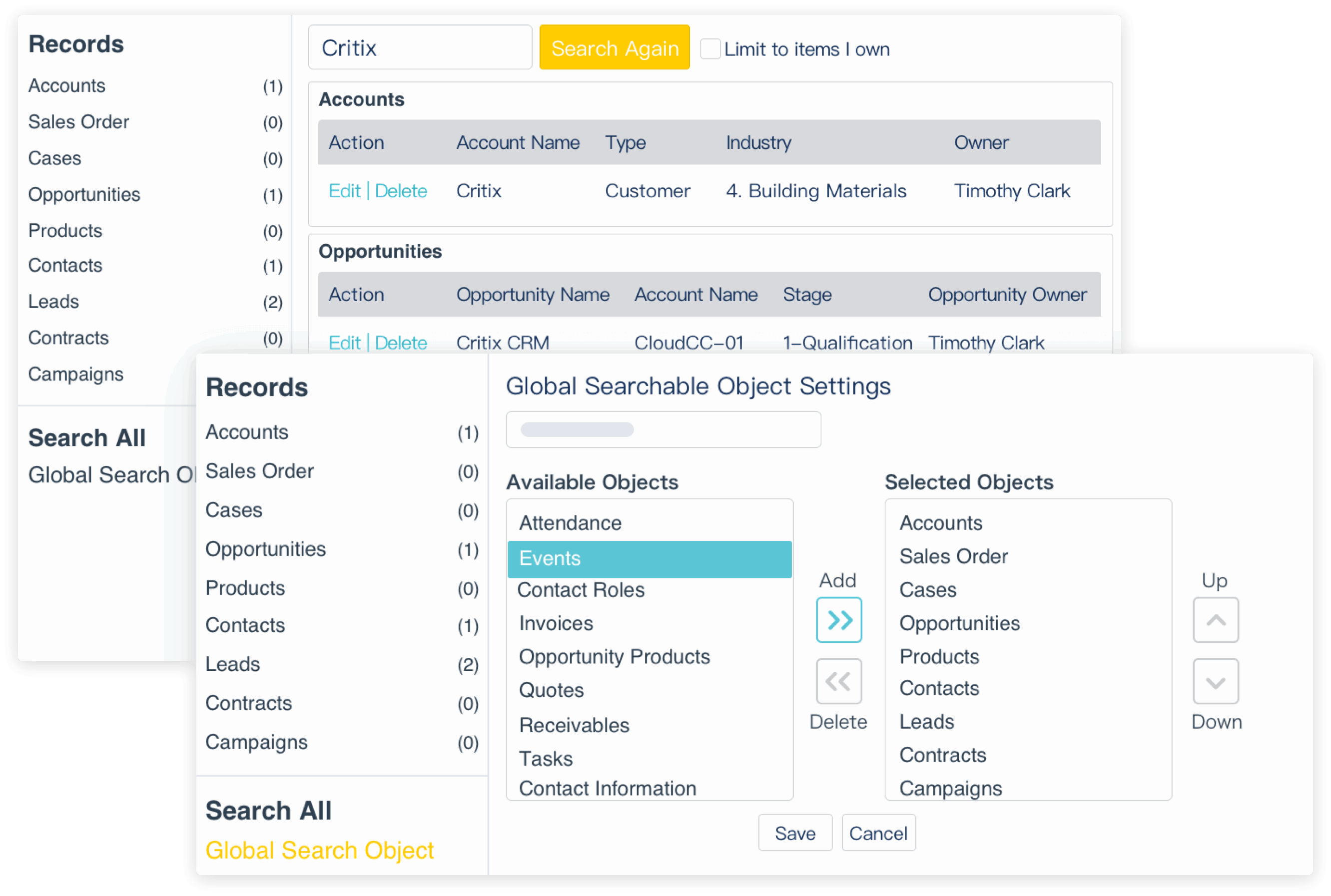 Das Suchfeld am oberen Rand der Hauptschnittstelle zeigt bis zu 10 aktuelle Zugriffsdatensätze an, die direkt angeklickt und geöffnet werden können. Die Feldsuche nach bis zu 10 Objekten wird nach Eingabe des Inhalts unterstützt. Die Suche und Anzeige dieser Felder kann durch Anpassung der Ergebnismenge erfolgen. Jeder Benutzer kann Objekte, die häufig verwendet werden, als global durchsuchbare Objekte festlegen. Zum Beispiel können Vertriebsmitarbeiter, Leads, Konten, Kontakte, Opportunities und Verträge als globale Suchobjekte festgelegt werden. Kundendienstmitarbeiter können auch Tickets, Lösungen, Wissensdatenbanken und Konten als global durchsuchbare Objekte festlegen.