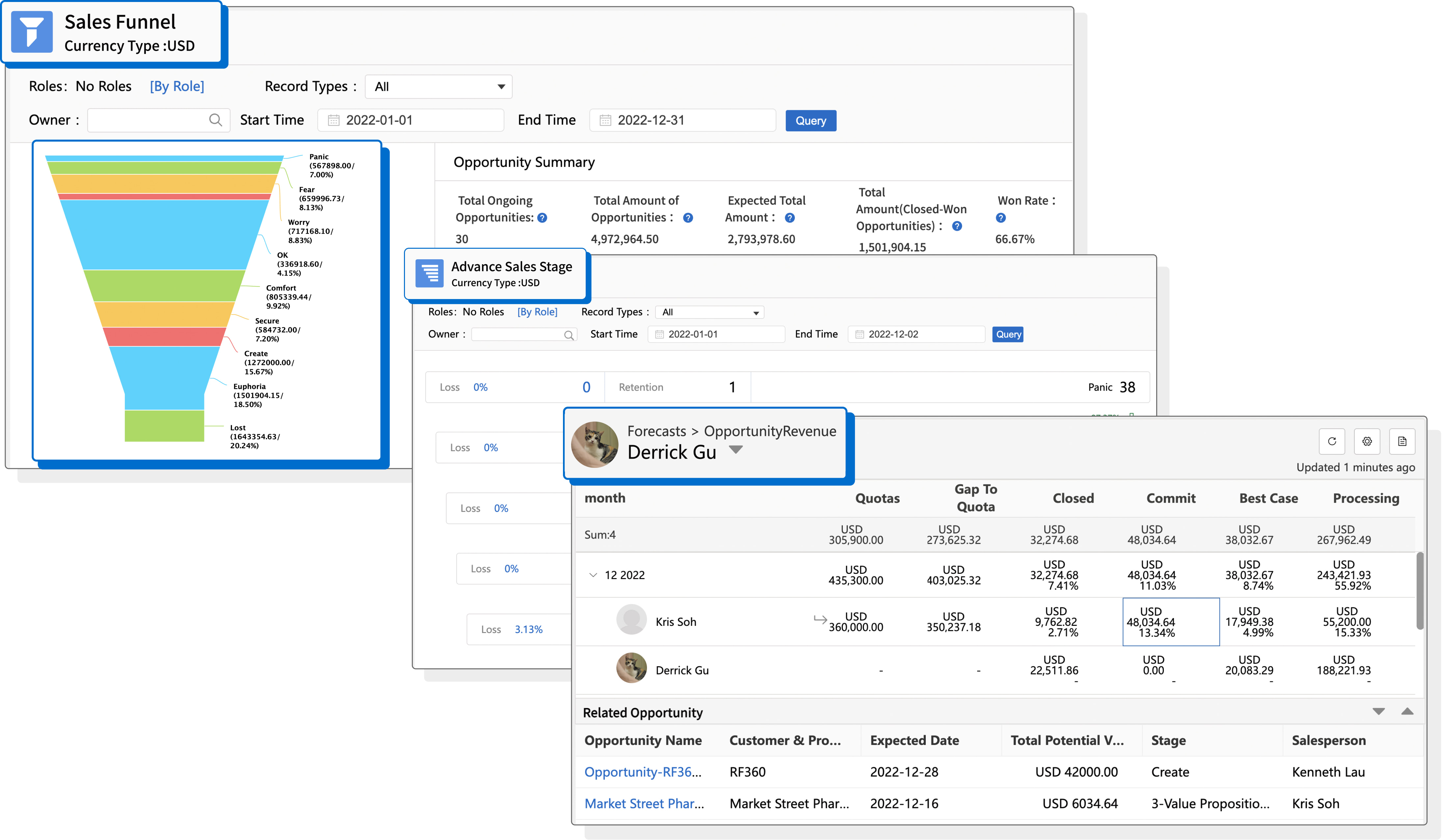 CloudCC CRM presenta el embudo de oportunidades de múltiples maneras para ayudar a gestionar y avanzar en las oportunidades de venta y reducir la posibilidad de perderlas.