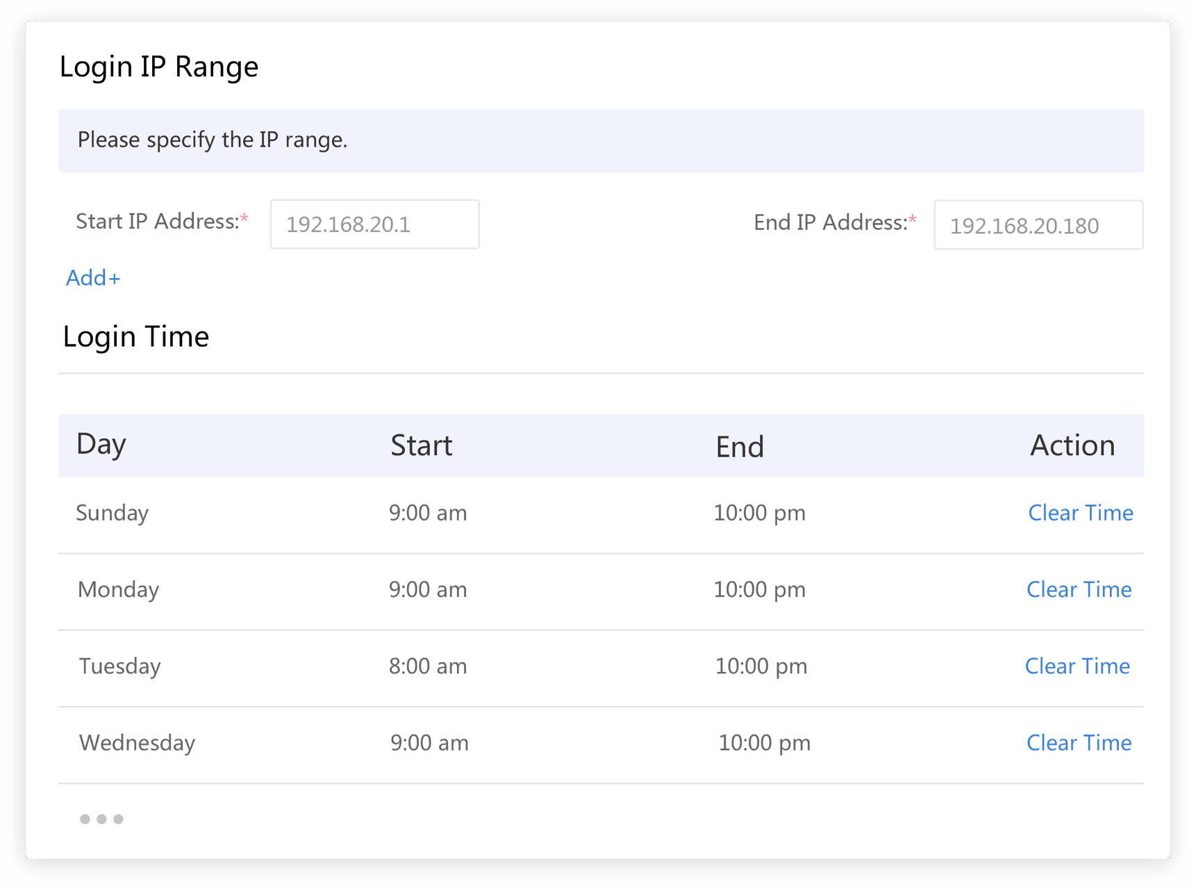 L'accès des utilisateurs peut être contrôlé en configurant la plage d'adresses IP de connexion et les heures d'ouverture de la connexion. Le temps d'accès hebdomadaire peut également être limité aux heures ouvrables de la journée de travail avec des plages d'adresses IP d'entreprise spécifiques. Toute connexion sera refusée si elle se fait en dehors des heures ou des plages d'adresses IP de l'entreprise stipulées.