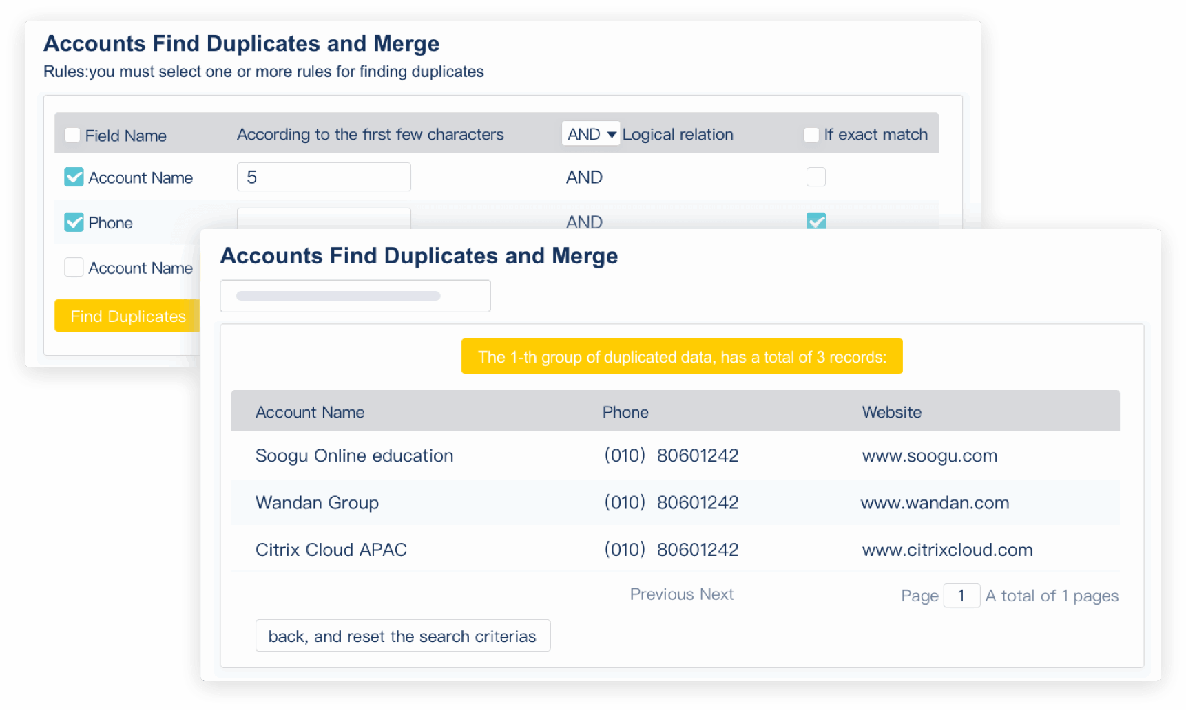 Pour assurer la qualité des données, utilisons la fonction de contrôle et de filtrage. Les règles de filtrage pour la détection des doublons peuvent être définies comme suit : Les doublons sont identifiés lorsque le numéro de téléphone et l'adresse électronique sont identiques. Si un utilisateur saisit ou modifie un lead avec les mêmes champs de numéro de téléphone et d'adresse email, l'enregistrement ne peut pas être sauvegardé.