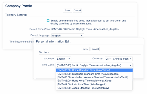 CloudCC prend en charge plusieurs fuseaux horaires. Les utilisateurs peuvent sélectionner le fuseau horaire correspondant à leur emplacement, et le système affichera l'heure en fonction du fuseau horaire de l'utilisateur. Dans le rapport et la vue, la requête sera également exécutée en fonction du fuseau horaire de l'utilisateur actuel. Par exemple, dans la vue des pistes d'aujourd'hui, les données vues par les utilisateurs dans différents fuseaux horaires peuvent être différentes, car l'affichage des données des pistes est basé sur le fuseau horaire de l'utilisateur actuel.