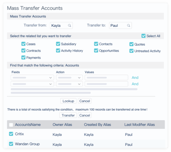 Toute personne qui est le propriétaire de l'enregistrement ou qui se trouve à un niveau supérieur dans la hiérarchie des rôles ou des régions peut transférer un seul enregistrement à un autre utilisateur. Lorsque vous transférez des données par lots, vous pouvez vérifier les données de liste liées à transférer en même temps. Par exemple, après la démission d'un vendeur, tous les enregistrements de données appartenant au vendeur peuvent être transférés au successeur.