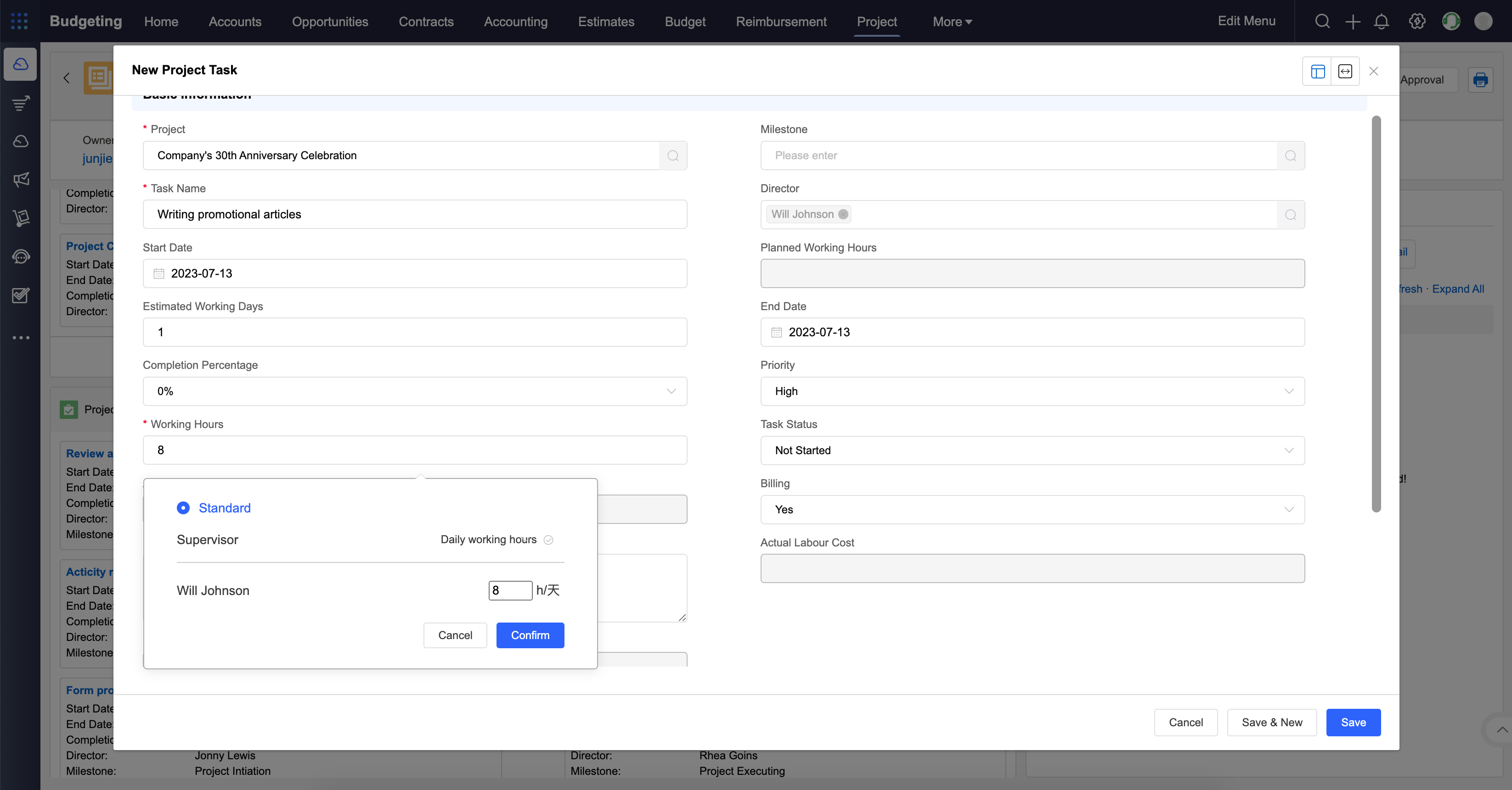CloudCC Budgeting integruje się z CloudCC Project. Po wygraniu szansy, jeśli w proces dostawy trzeba zainwestować siłę roboczą, można zainicjować projekt, przydzielić zadania, a przydzielona osoba rejestruje swoje godziny pracy. Planowane godziny nie mogą przekroczyć godzin budżetowych, a rzeczywiste godziny pracy nie mogą przekroczyć godzin planowanych.