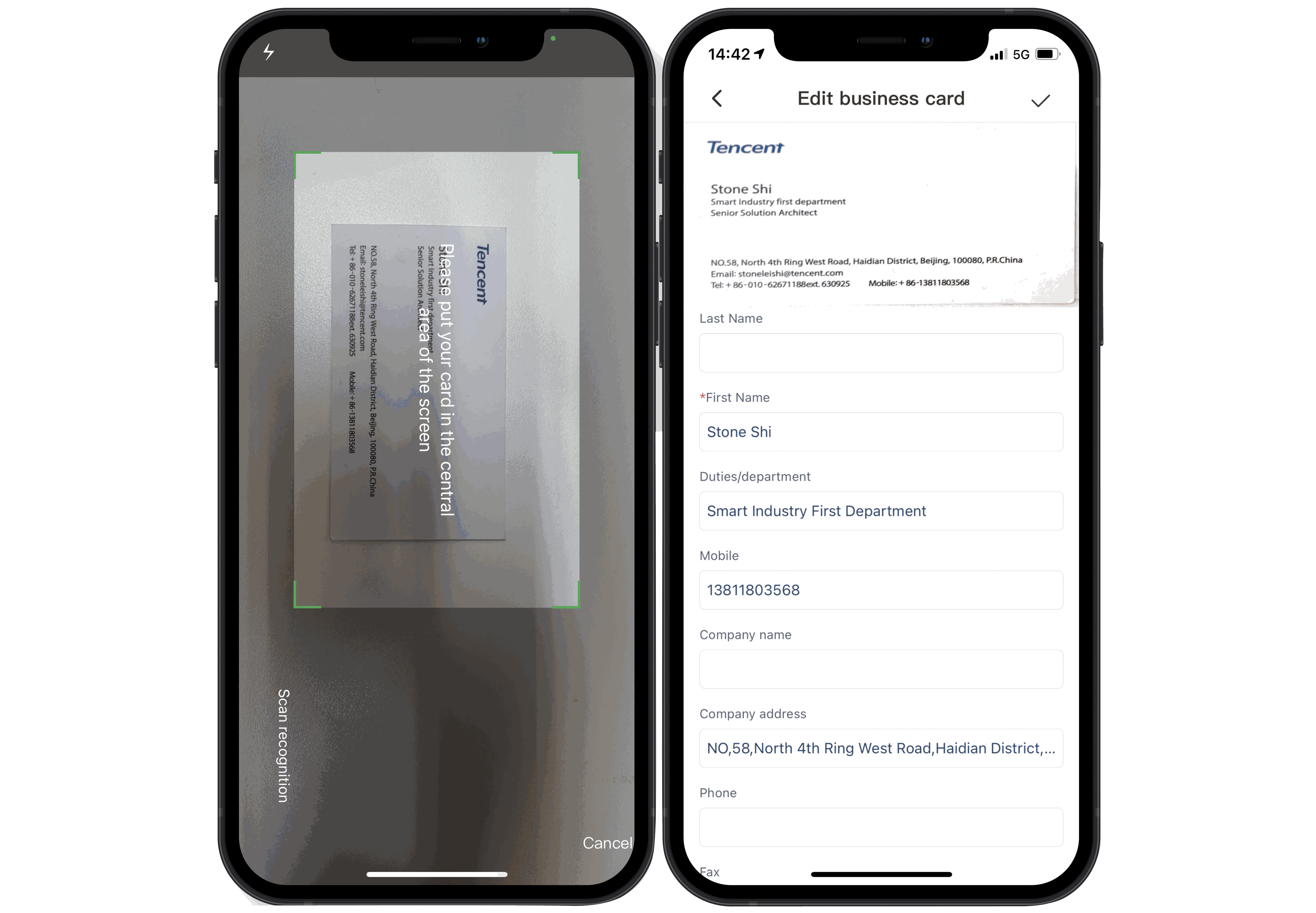 Автоматический сканер визиток CloudCC позволяет использовать камеру на вашем iPhone или телефоне Android для получения фотографий визитных карточек и импорта их непосредственно в CloudCC CRM в качестве контактов.