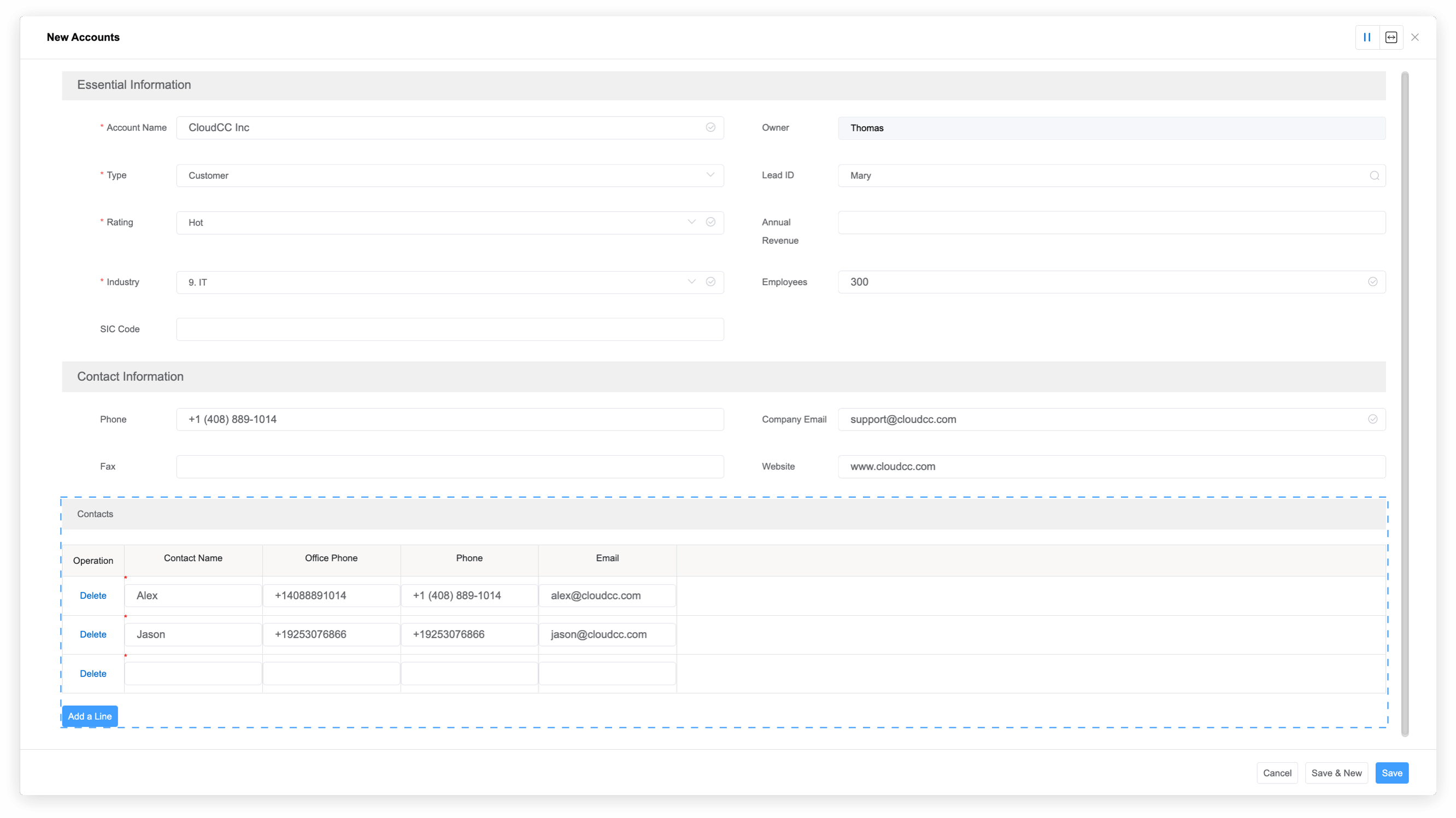 Функция ввода основных и детальных записей позволяет быстро создавать новые основные записи и соответствующие им детальные записи. Например, при создании нового заказа на продажу необходимо ввести элемент детализации заказа на продажу на той же странице и включить функцию ввода masterdetail. Эта функция очень подходит для объекта отношения мастердеталь. Вы можете установить, сколько строк отображается по умолчанию для дочерних записей, и добавить дополнительные записи, нажав кнопку "Добавить строку". Вы также можете установить поля подробной записи с помощью компактных макетов.